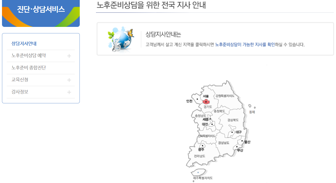 • 전문 컨설턴트(재무설계사, 사회복지사 등)와 1:1 상담을 통해 개인 맞춤형 노후준비 전략을 세울 수 있습니다.
