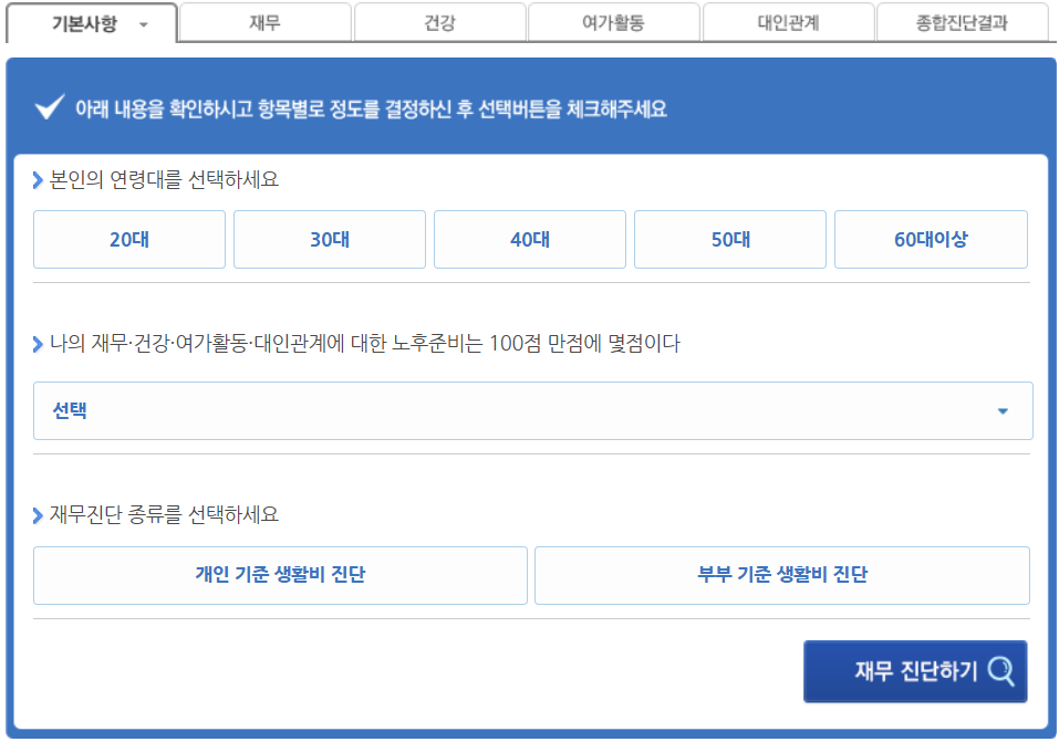 • 노후준비 종합진단지 작성: 37개의 문항으로 구성된 진단지를 통해 개인의 노후준비 상태를 종합적으로 평가합니다.
