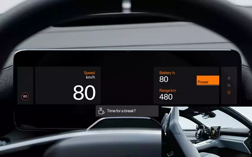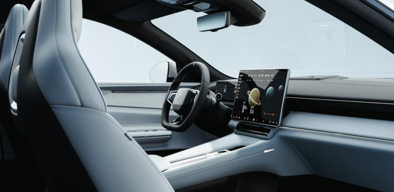 폴스타 4의 실내는 미래 지향적 디지털 기술을 강조하며, 물리 버튼을 최소화했습니다.