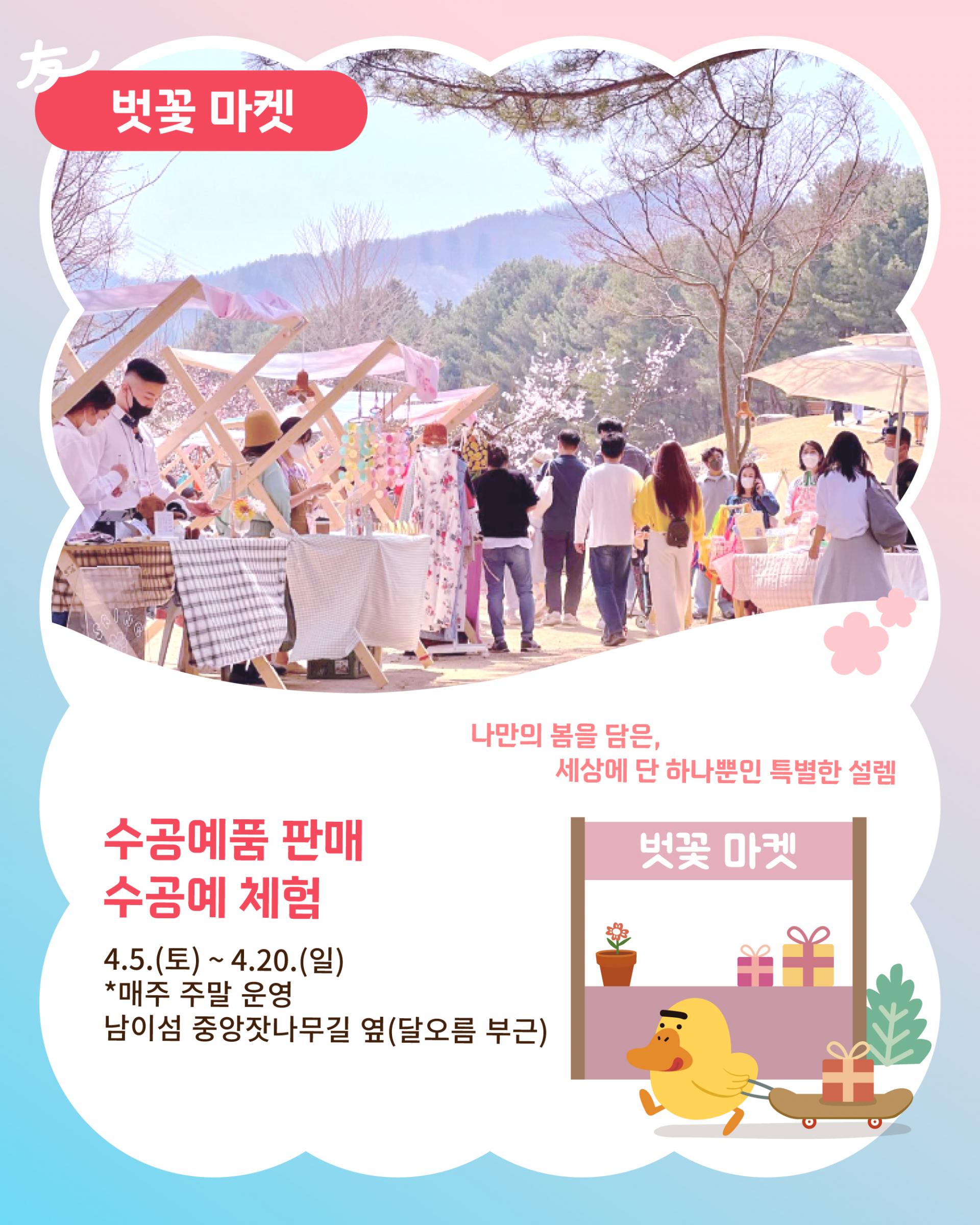 벗(友)꽃 마켓 & 체험 핸드메이드 수공예품 판매와 체험 공간이 마련된 벗(友)꽃 마켓은 방문객들에게 아기자기한 재미를 선사한다. 자신만의 특별한 기념품을 직접 만들어볼 수 있는 체험은 봄날의 즐거움을 배로 만들어준다.