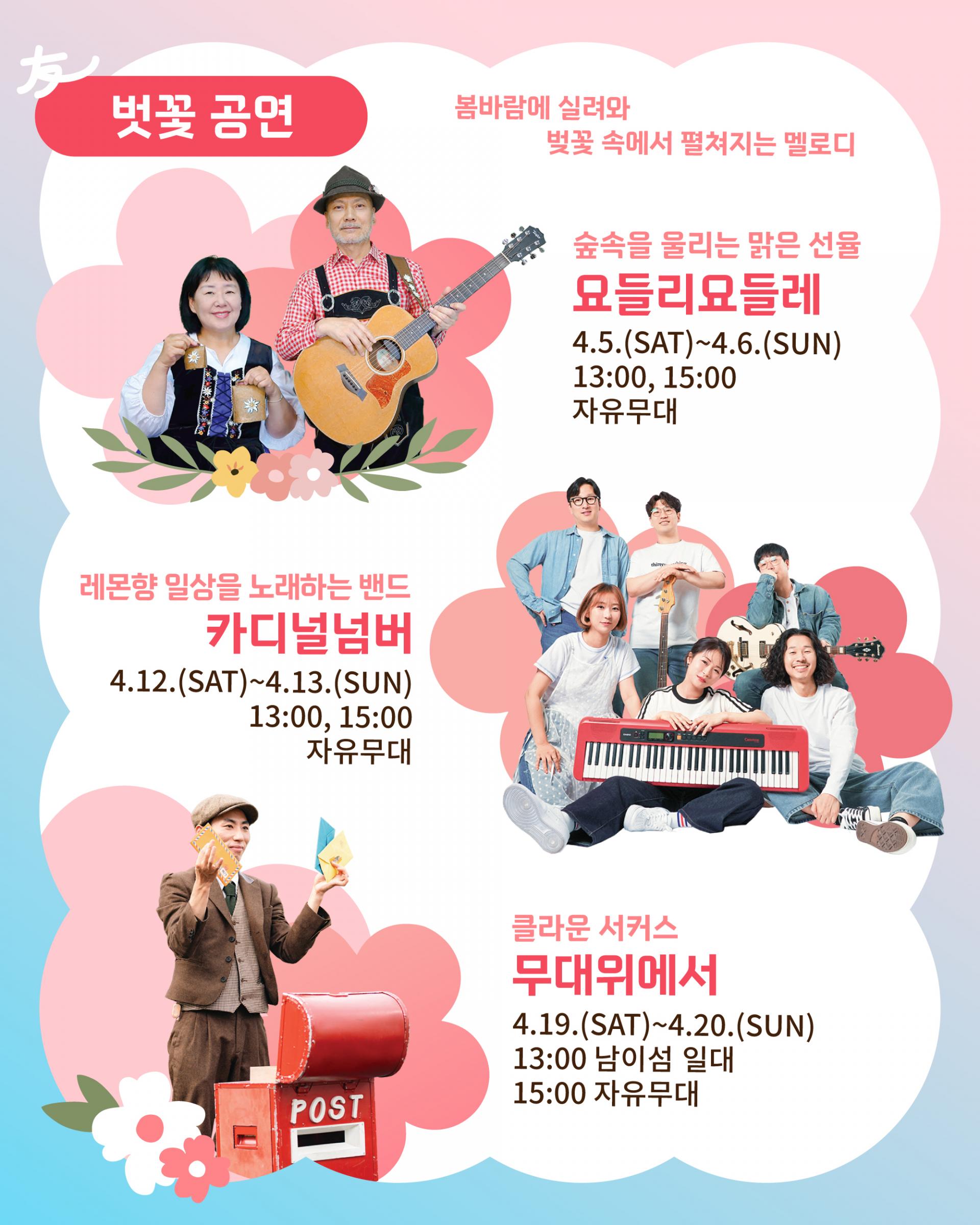 - 벗(友)꽃 공연: 남이섬 곳곳에서 펼쳐지는 다양한 공연으로, 음악과 춤이 봄날의 낭만을 더한다.