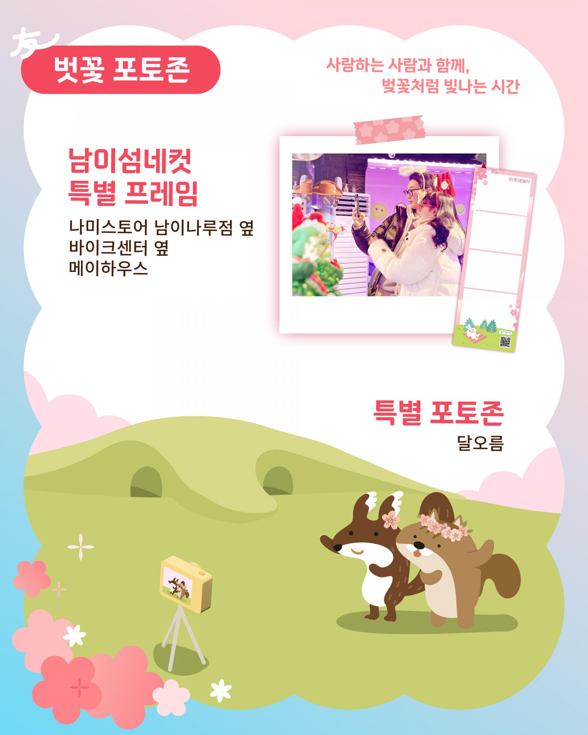 벗(友)꽃한컷 포토존 & 남이섬네컷 특별 프레임 남이섬에는 벚꽃을 배경으로 촬영할 수 있는 포토존이 다수 설치되어 있다. 특별 제작된 포토 프레임에서 찍는 기념사진은 남이섬을 방문한 날의 소중한 추억으로 남는다.
